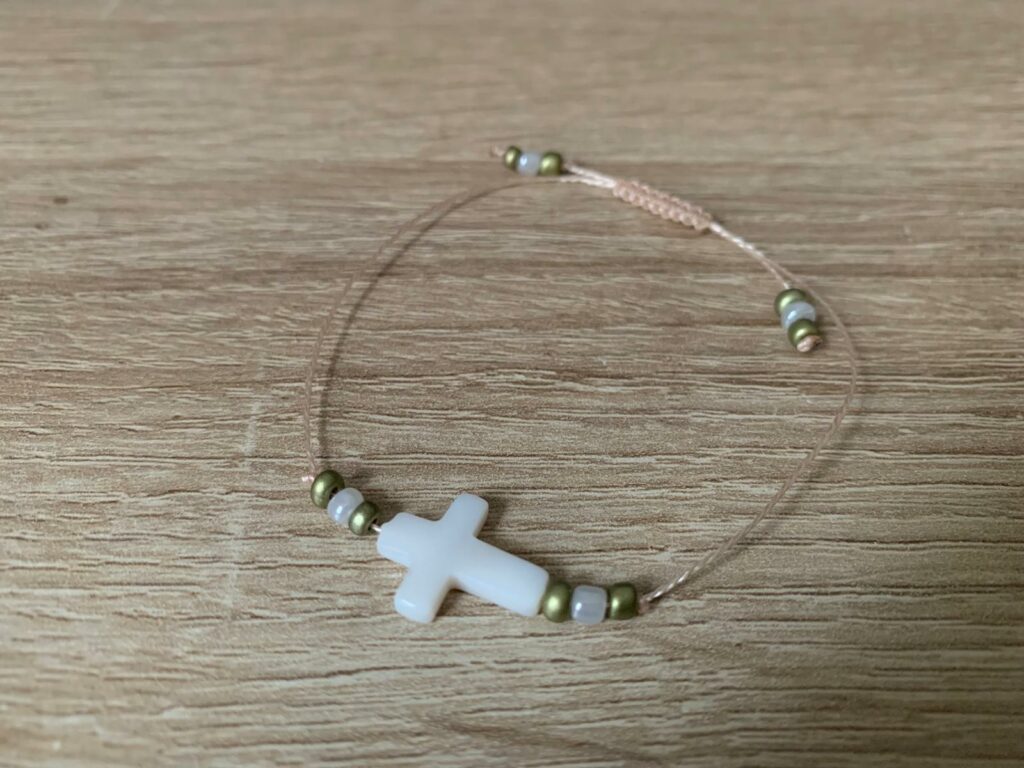 Croix en nacre naturelle avec perles de verre blanches